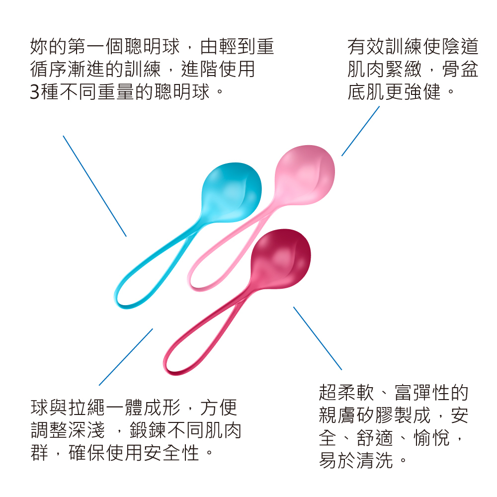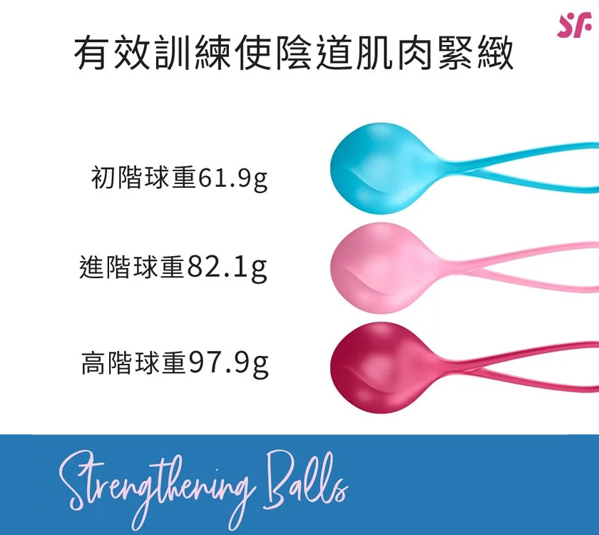 單球聰明球包括3種不同重量, 最輕的球重61.9g(初階),中間的重82.1g(進階),最重的97.9g(高階),直徑35mm,幫助逐步訓練盆底肌。